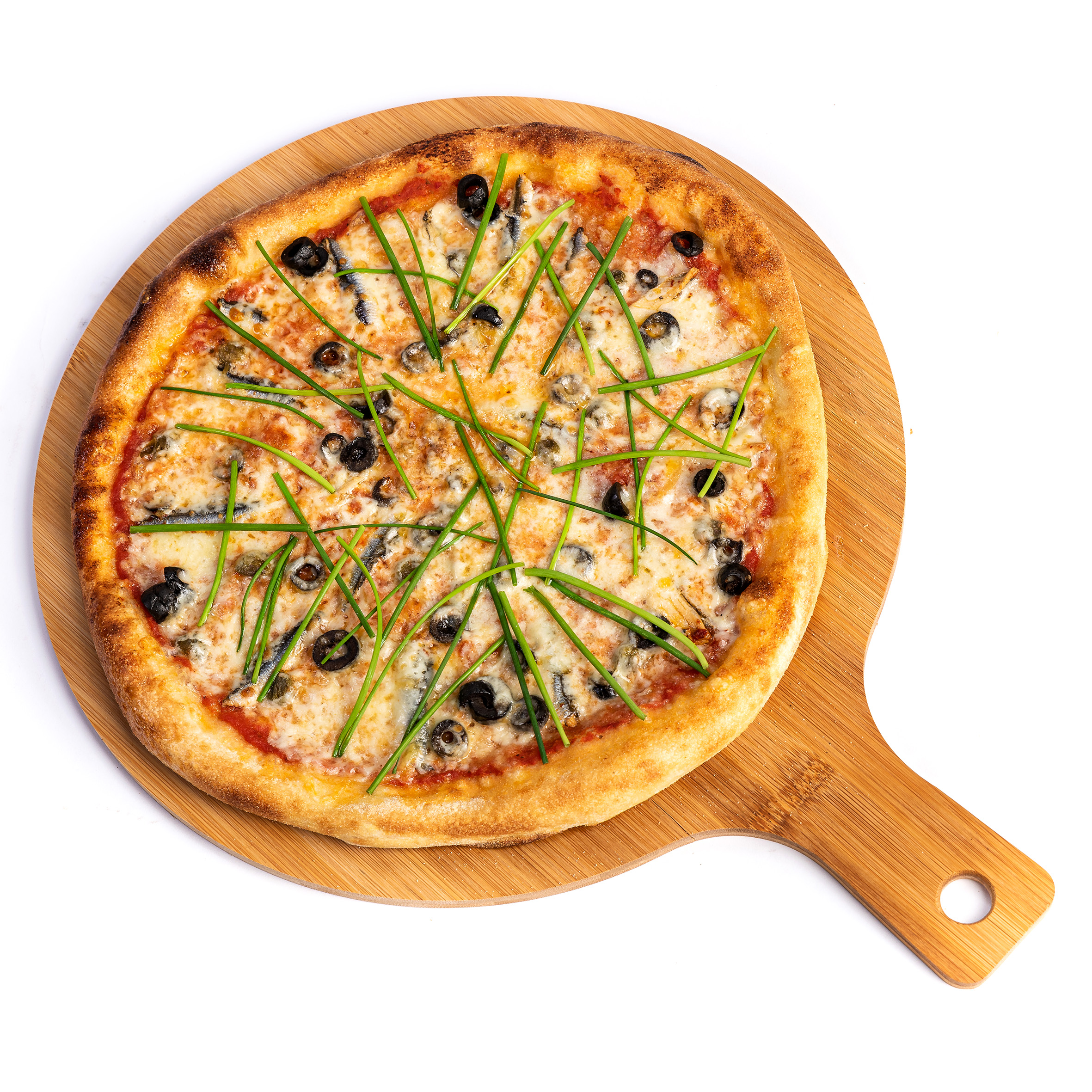 sos rosii, mozzarella, file sardine picante, capere, masline, chivas, zeama lamaie