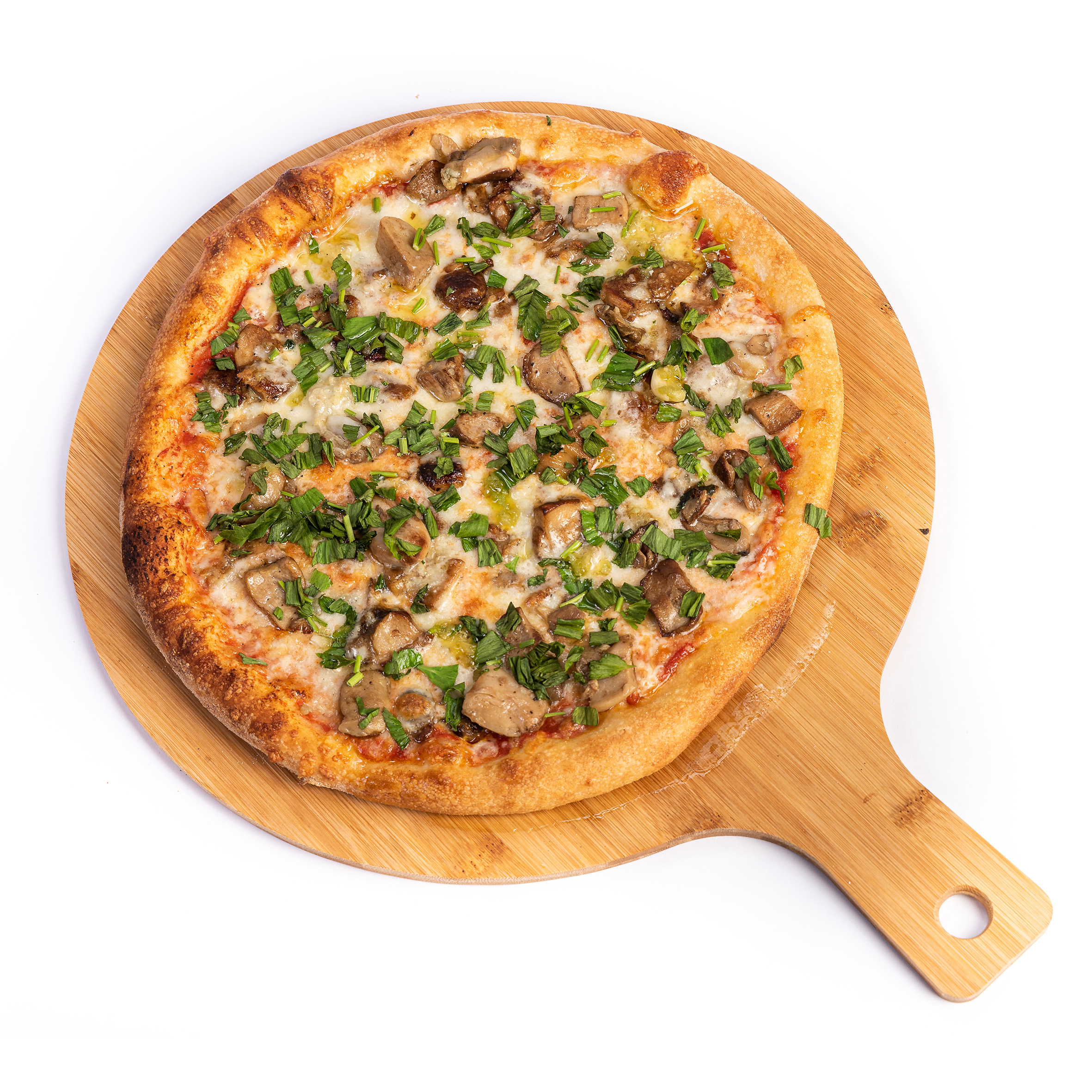sos rosii, mozzarella, hribi cu usturoi, gorgonzola dolce, patrunjel proaspat
