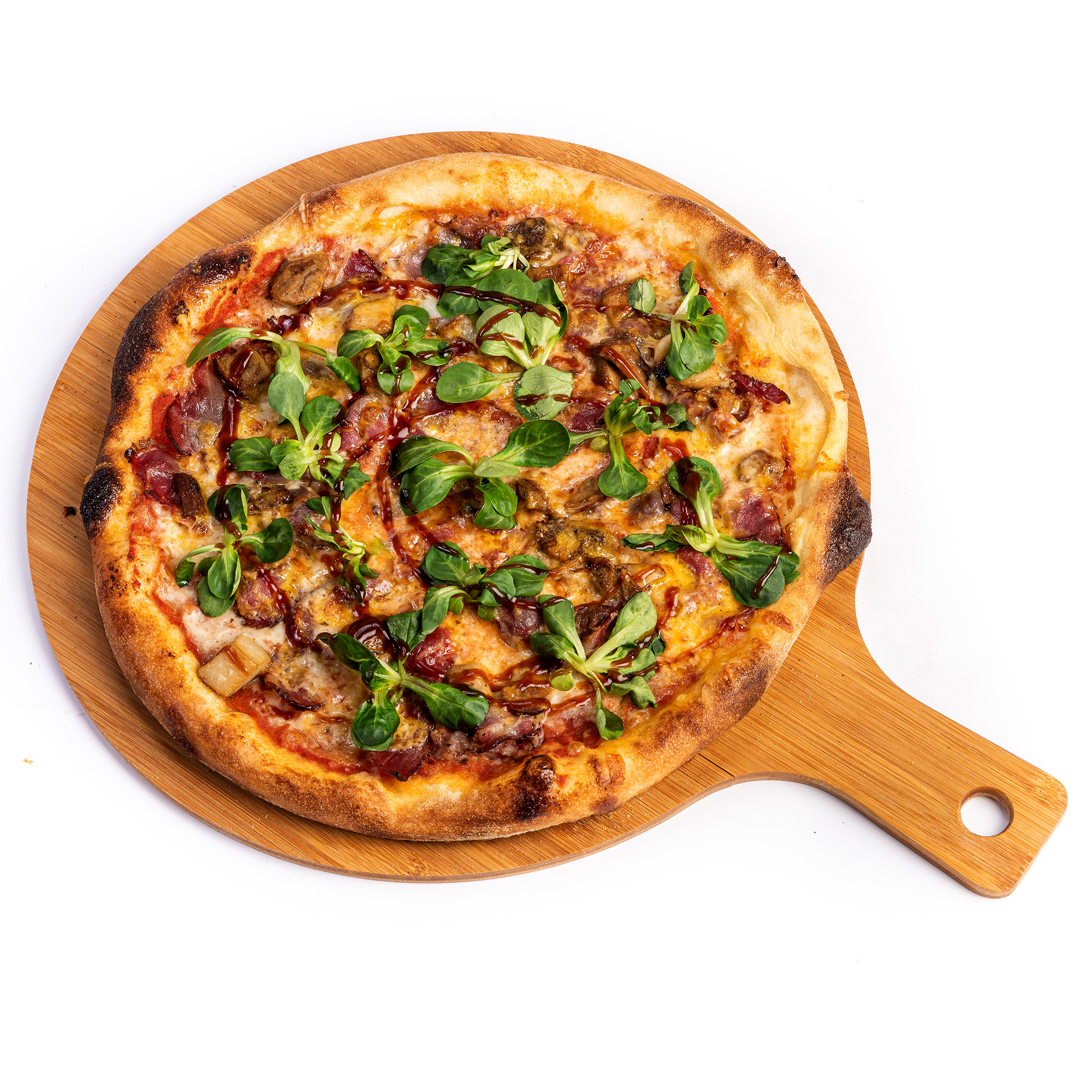 sos rosii, mozzarella, coppa, hribi, cheddar, valeriana, bbq sos