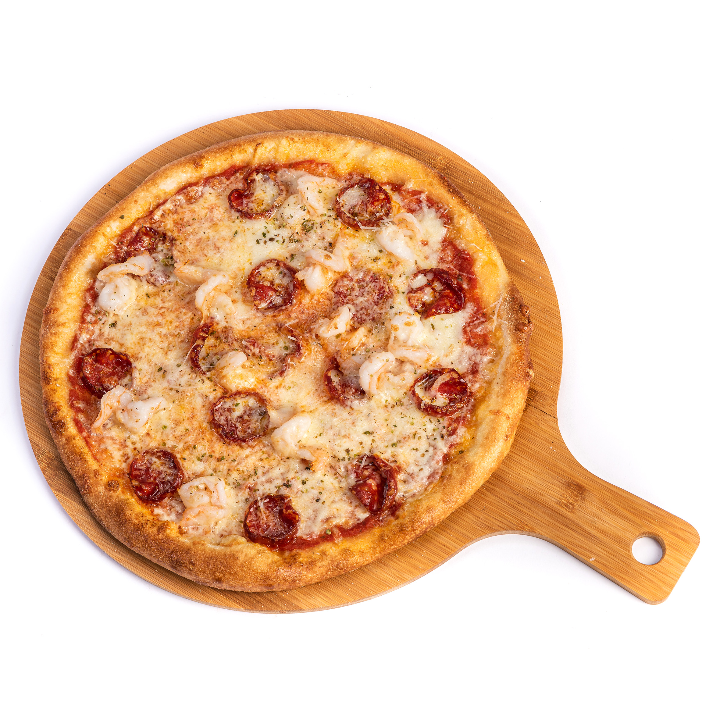 sos rosii, mozzarella, creveti trasi in vin cu usturoi, salam picant, parmesan, oregano